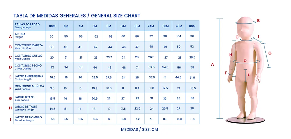 Sizes are normally expressed in months or years, from 0 months to 4 years, although the most important factor is not just age, but the child’s actual measurements: height, chest circumference, waist, hips and other proportions that determine the ideal fit.